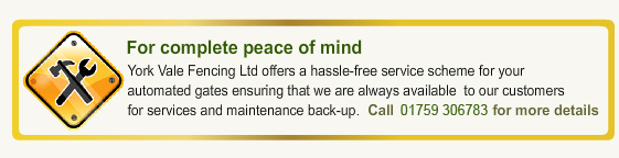 Track GatesYork Vale Fencing can fit the perfect track gate for your requirements. We professionally survey your installation area and advise you on the best system for you. We fit commercial, industrial or domestic gates so you can be sure of high quality secure work. We can also fully customise your gates to fit perfectly with your surroundings. Just request a quote for more details. |